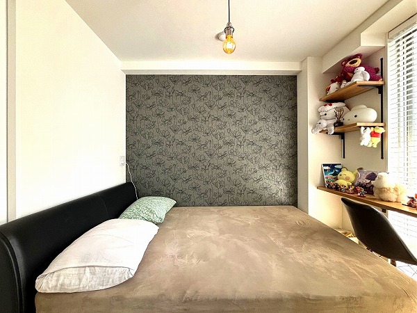 約3.6帖の洋室はブラックのアクセントウォールで空間にメリハリをプラス。写真のように大きなベッドを置いても十分な余裕があり、家具やインテリアで自分らしいスタイルを楽しめるお洒落な空間に✧