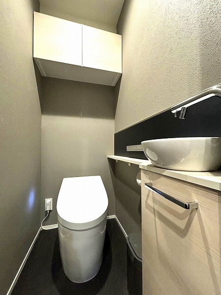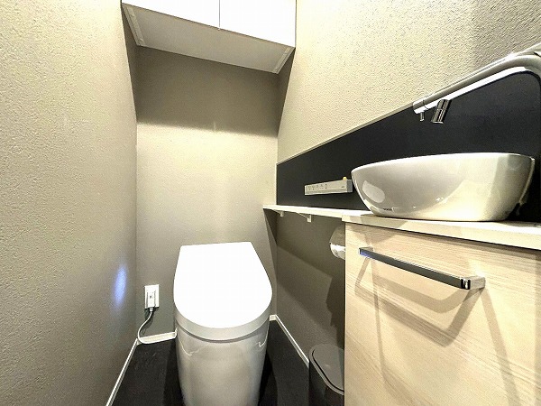 収納付き1面鏡とベッセルタイプの洗面台を備えた洗面化粧台は、見た目もお洒落。モノトーンテイストで統一され、空間に引き締め感とカッコよさをプラス。毎日の身支度がスタイリッシュに楽しめそうですね♩