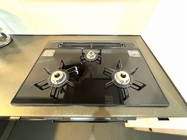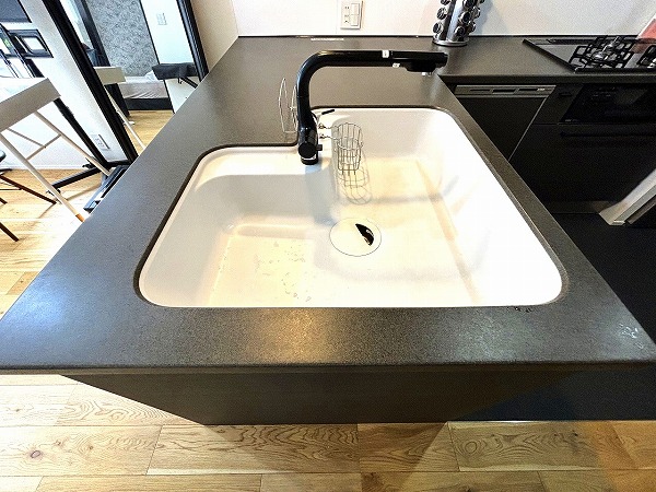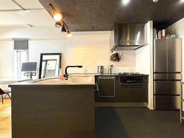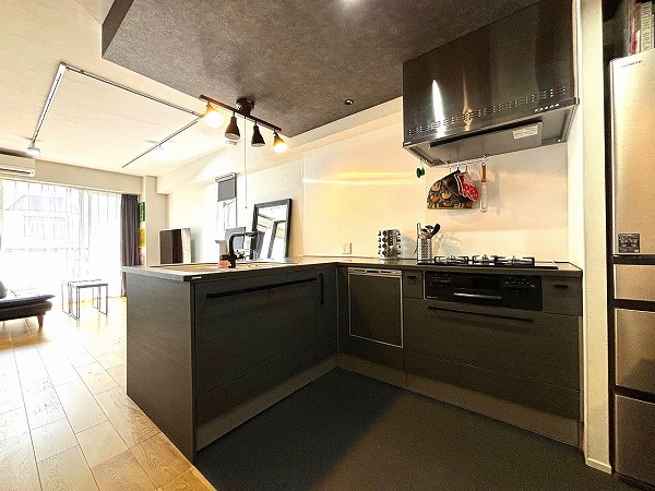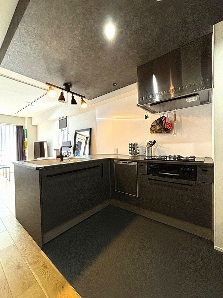 ブラックカラーで統一された目を惹くL型キッチンは、「TOPCLAS」のハイグレード仕様。収納も豊富で使い勝手抜群。空間全体のアクセントとして存在感を放ち、シックで洗練された料理時間を楽しめるスペースに仕上がっています♥