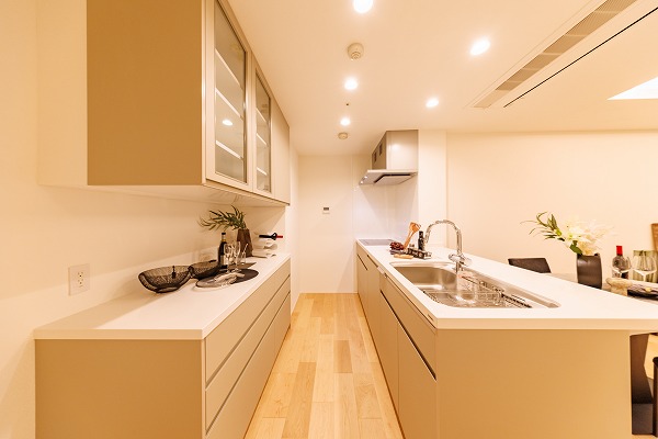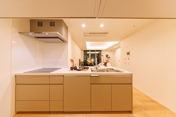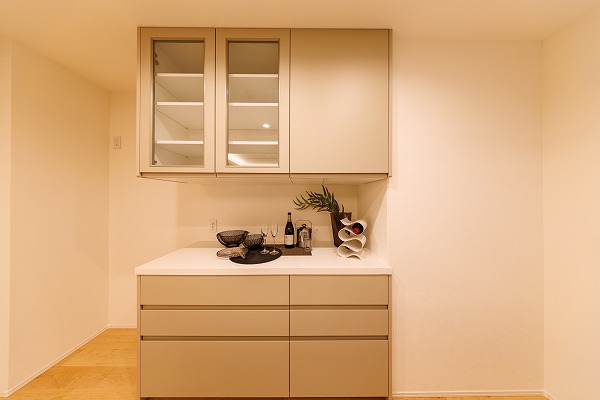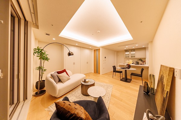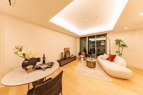 メインとなるリビングダイニングキッチンは、約17.0帖の広さを誇る開放的な空間。折り上げ天井に設えられた間接照明が天井面を柔らかく照らし、室内全体に心地よい陰影を生み出します。ソファやダイニングテーブルを配置しても窮屈さはなく動線もスムーズ。さらに収納棚が備えられているため、日用品やストック類をすっきりと隠せるのも嬉しいポイント。