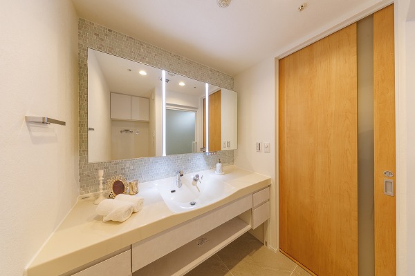 パステルカラーのタイルが印象的な洗面化粧台は、空間にやさしい彩りをプラス。大きな3面ミラーキャビネットにはライトが内蔵されており、顔全体を明るく照らしてくれます。洗面ボウルの両サイドには作業スペースが確保され、メイクやスキンケア用品を広げても余裕のある設計。毎日の支度時間が少し楽しみになりそうですね。