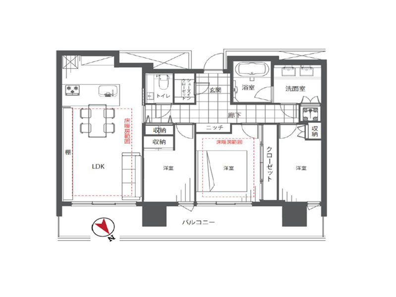 リビングダイニングキッチンには、大きめのソファやテーブルなどの家具も余裕を持って置ける広さがあります。床暖房付きなので、引越し直後から快適な暮らしをスタートできます。まさに快適さと機能性を追求した住空間。