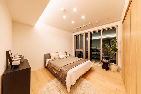 約10.0帖のベッドルームは、ただ「寝る」だけに留まらない多目的な空間です。ダブルベッドはもちろんデスクやドレッサーを配置しても余裕があり、暮らし方に合わせた使い方が叶います。さらに大容量のウォークインクローゼットを完備しており、衣類や季節物、小物類までしっかり収納可能。空間を美しく保ちながら快適な毎日を支えてくれますよ♪