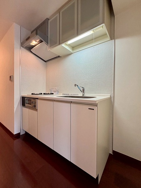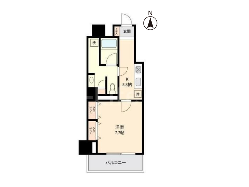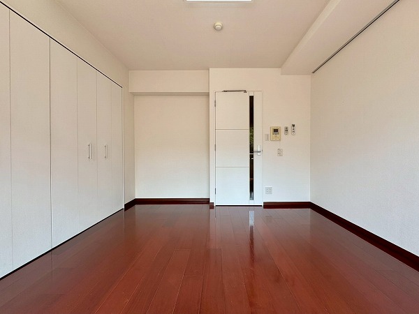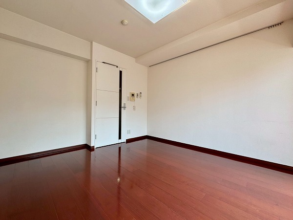 専有面積34.66㎡の1Kは、無駄のないレイアウトと明るい南向きが魅力。7.7帖の洋室には上品なフローリングが敷かれ、モダンな都会暮らしを演出します。1人暮らしを始める方にぴったりの居心地です。