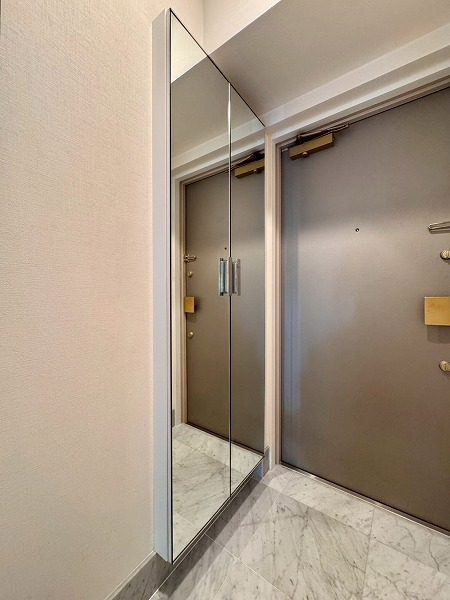 玄関のシューズクローゼットには姿見を備え、広がりを感じさせるデザインに。収納力も高く、靴や小物を整理して清潔感のある空間を保てます。外出前に全身を確認できるのも嬉しいポイントです。