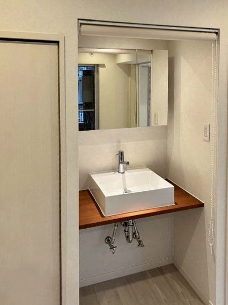 ロールカーテンの向こうには、シンプルでおしゃれなフロートタイプの洗面台が。インテリアの一部のように美しく収まり、ホテルのような非日常感を演出します✧また、クローゼットの隣にあるので、朝の身支度もスムーズ。忙しい朝でも気分良く1日を始められますね。