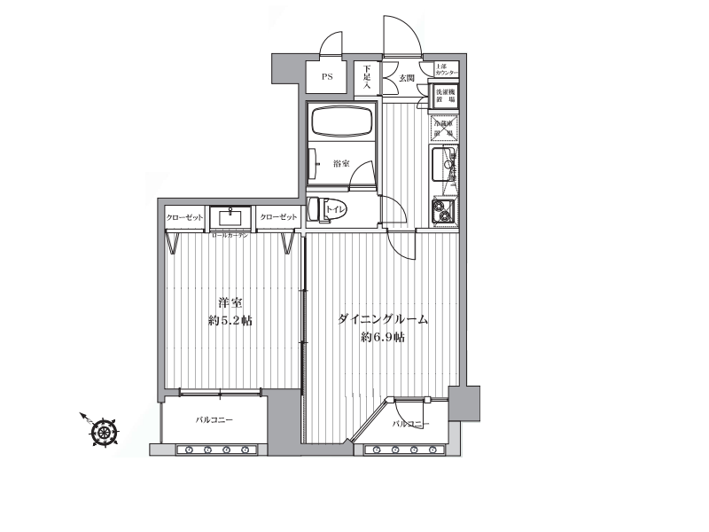 限られた玄関スペースを有効活用。シンプルなシューズボックスを設置し、清潔感をキープ!廊下にある洗濯機置き場は扉付きで、生活感を上手に隠せます。来客時も安心のすっきり空間です。