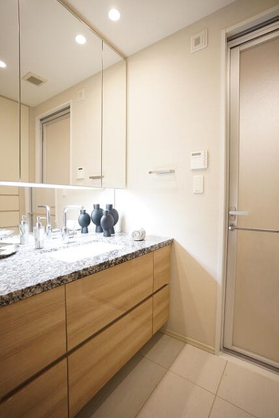 すっきりと整えられたパウダールームには、3面鏡付きの洗面化粧台を設置。鏡裏にも収納があり、スキンケア用品や小物類をきれいに収められます。そばにはリネン庫も備わり、タオルやストック類の整理もスムーズ◎