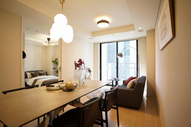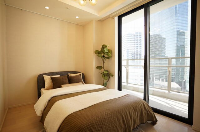 隣接する約5.3帖の洋室は、スライドドアで軽やかに仕切れる設計。扉を開ければ開放的なワンルームのように、閉じれば落ち着いた寝室として心地よく使い分けが可能です。バルコニーに面した北西向きの開口部からは、高層ビルが並ぶ都心らしい景色と、その先に広がる青空を望みます。強すぎない光が穏やかに差し込み、時間帯ごとに異なる表情を楽しめるのも魅力。
