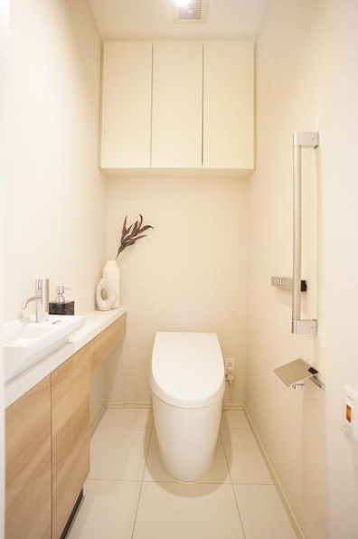 白の清潔感に木目のぬくもりを掛け合わせたやわらかな印象のトイレ。手洗いカウンターを備え、来客時も気持ちよく使える仕様です。カウンターに小さなグリーンやディフューザーを置いて、インテリアを楽しんでみては✿