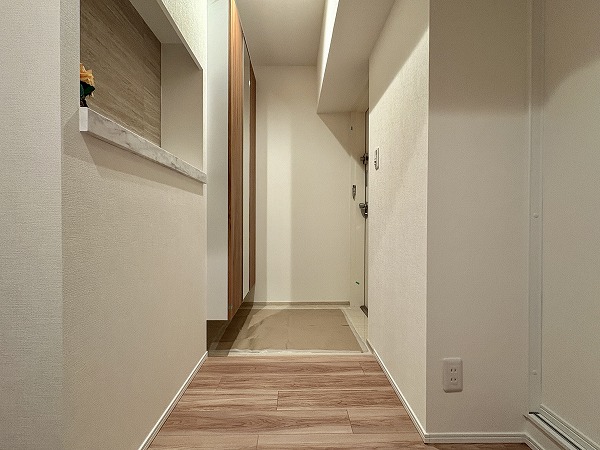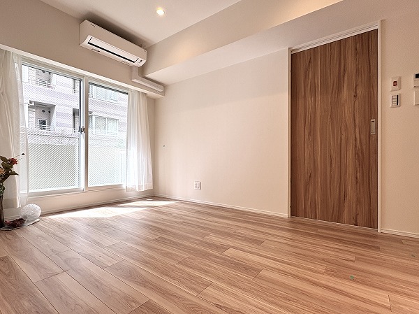 全体的に木目調の柔らかな色味で構成されているお部屋で、東京の中心部でありながら落ち着ける、特別感のあるお部屋でした。メインルームはレイアウトを決めやすい縦長の造りで、家具選びがスムーズに行えます◎北欧風の優しい色味の家具などは相性が良く、より温かみのある雰囲気でリラックスできそう。晴れた日には南西向きの窓からは温かい日差しが入るので、おうちでのんびりとした時間を過ごすのも至高です。このお部屋の間取りは2LDKで、新婚の方や単身の方などにオススメしたいです✧