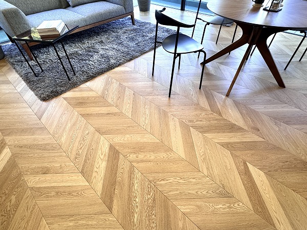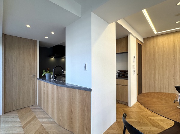 ご紹介したのは最上階・6階の角住戸。専有面積79.08㎡の2LDKとゆとりのある設計です。約18.9帖のLDKは2方向に大きな窓が設けられ視線が外へ抜けるため開放感に溢れています。インテリアコーディネートによってモダンにもナチュラルヴィンテージにも相性の良いヘリンボーン柄の床が落ち着きと上質さを演出。