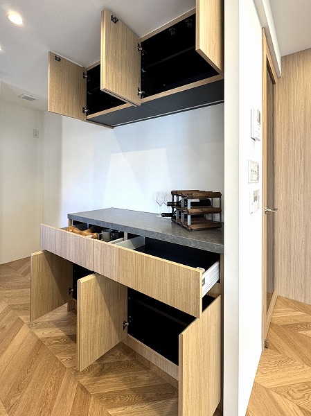 開放感溢れるエントランスは、外観と同じくレンガ貼りで統一。温かみがあり帰宅する度にホッとできそうな空間になっています。吹き抜けになっていて、明るい日差しが射し込み気持ちが良いですね。
