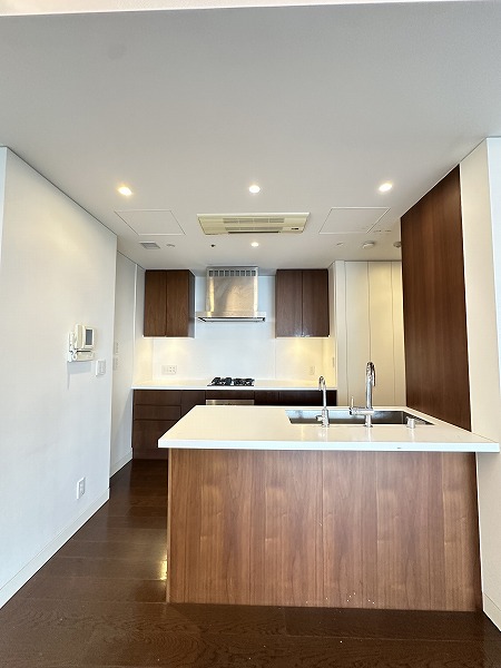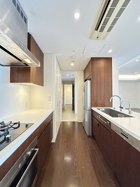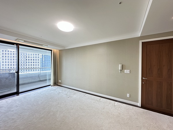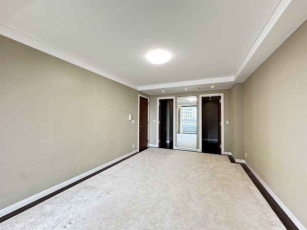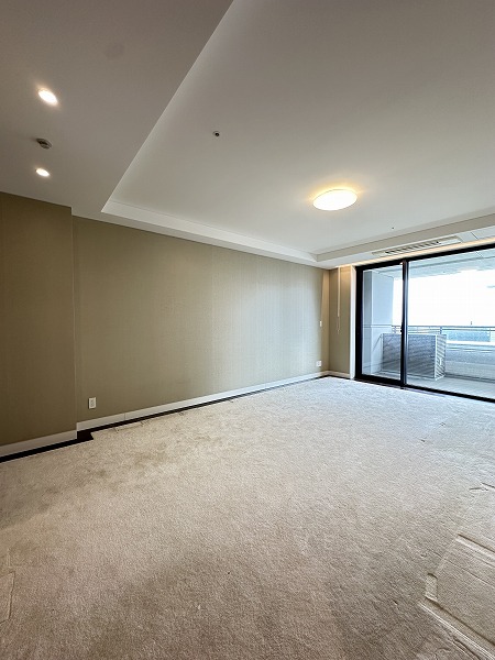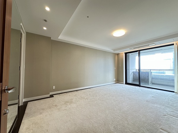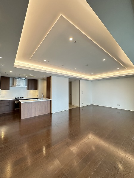 今回ご紹介するのは、その20階部分に位置する一室。専有面積はなんと130㎡超えという、ゆとりあふれる2LDK住戸です。広さに対して居室数を抑えた設計となっており、自然とご家族がリビングに集まるような開放的な間取りが印象的でした。メインルームは約23.9帖もの広さを確保。大型のソファやダイニングテーブルを置いても余裕があり、ゆったりとした時間を過ごせそうです。床暖房が備わっているため寒い季節でも足元からやさしく温まり、ビルトインエアコンの採用により空間がすっきり整っている点も魅力です。