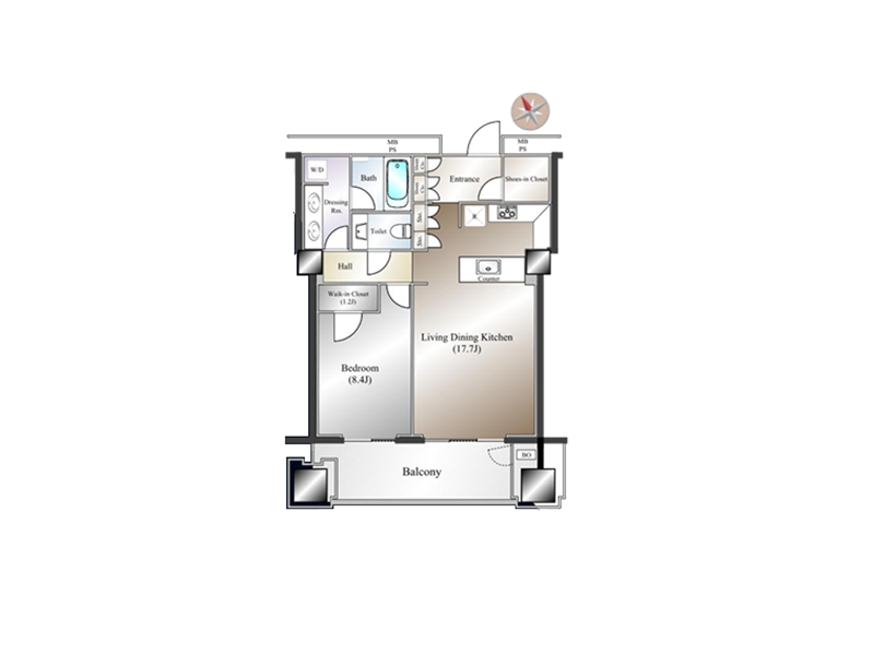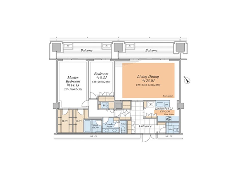 メインルームは約23.9帖の広々とした空間。リビングとダイニングをゆったり配置しても余裕があり、大型家具の設置も可能です。床暖房が備わっているため寒い季節でも足元からじんわり暖かく、お部屋全体を均等に温めてくれます。さらにビルトインエアコンを採用していることで空間がすっきりとし、高さのある家具もレイアウトしやすい点が魅力。