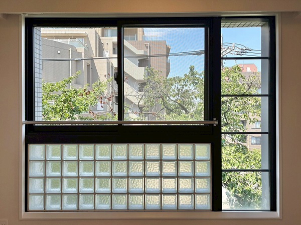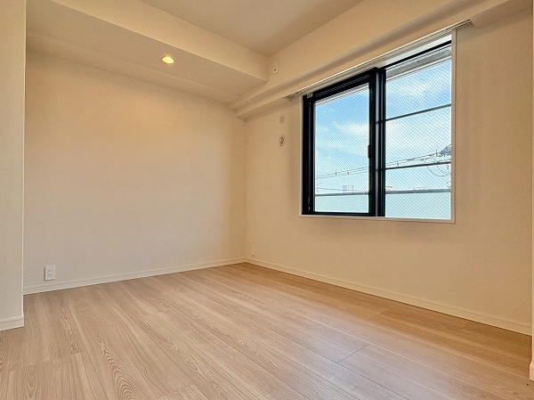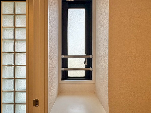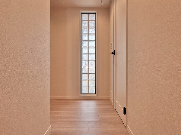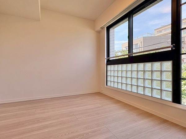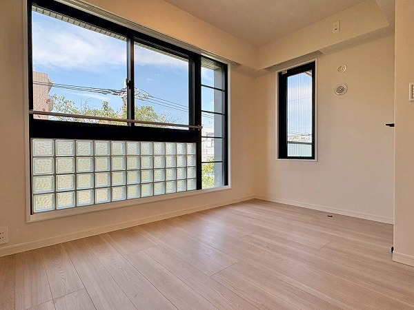 デザイン性の高いガラスブロック窓が印象的な約5.5帖の洋室。光を柔らかく取り込み、やさしい雰囲気を演出します。2面採光で日中は照明いらずの明るさで、お気に入りのインテリアが映える空間です♡