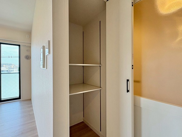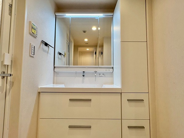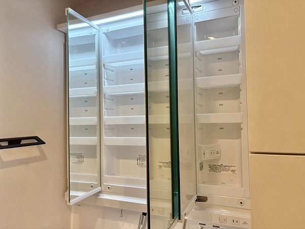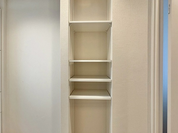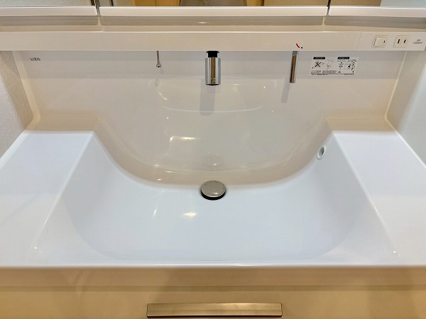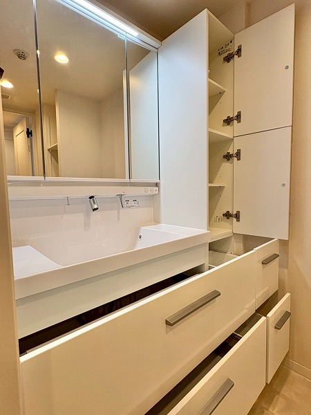 明るいホワイトトーンでまとめたサニタリールームは、シンプルながら機能的。壁面には可動棚を設け、タオルやストック品を整理しやすい設計です。洗面台下の収納も充実しており、使いやすさと美しさを両立しています。