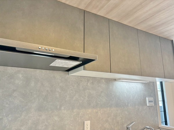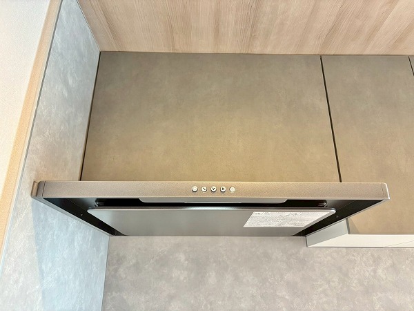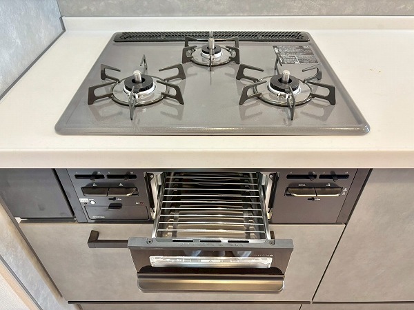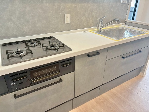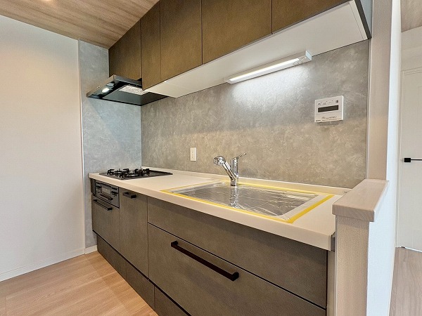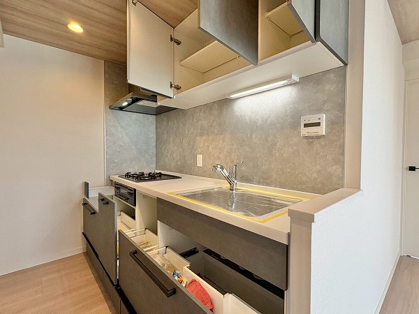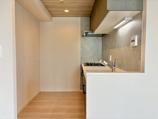 メインルームの奥まった位置に設けられた壁付キッチンは、生活感を抑えながらも実用的。ビルトインコンロが採用されており、スタイリッシュな印象を与えます。調理後もさっとお手入れでき、日々の家事が快適に◎