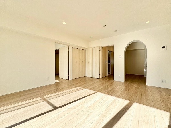 メインルームは約14.9帖のゆとりある広さ。シンプルで柔らかな色合いの内装に仕上がっており、インテリア次第で表情を変えられる自由度の高い空間に。家族が自然と集まる、居心地の良いリビングになりそうですね。