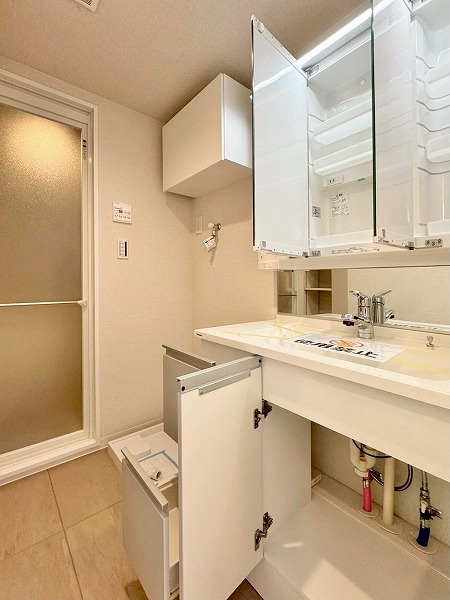 洗面化粧台・洗濯機置き場・浴室を1か所にまとめたサニタリールームは、家事動線が短く効率的。収納力のある洗面化粧台には、日用品やストック品もすっきり収まります。3面鏡仕様で身支度も快適。