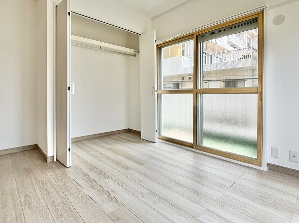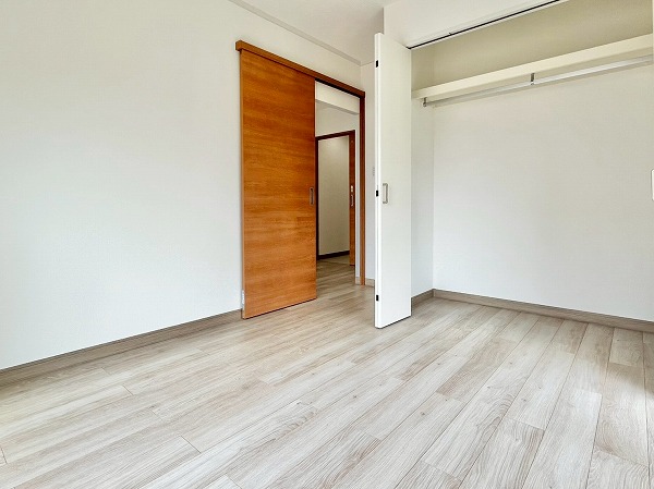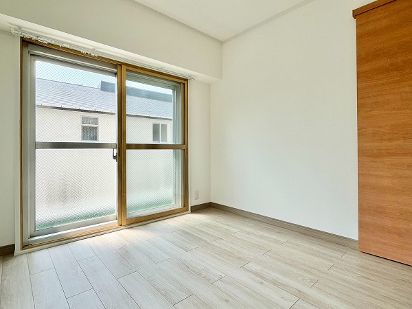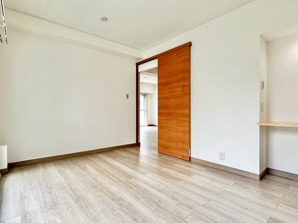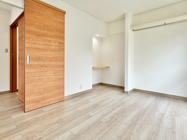 2つある洋室のうち、こちらは東側に位置する洋室。およそ5.2帖を確保し、大きめのベッドをおいてゆったりと身体を休められる環境です。奥のカウンタースペースは趣味の物を飾ったり、椅子を置いてデスク風の使い方をすることもできそうですね。