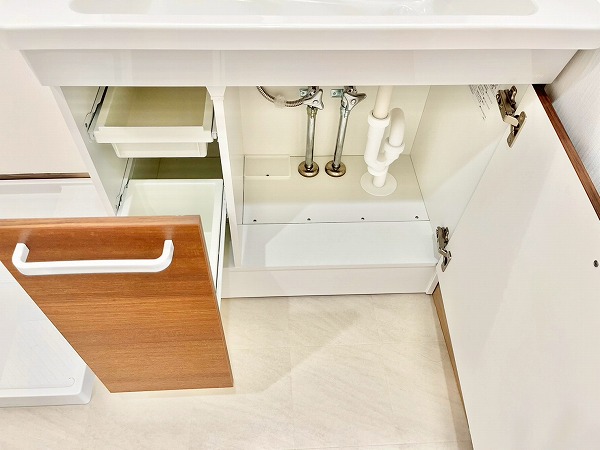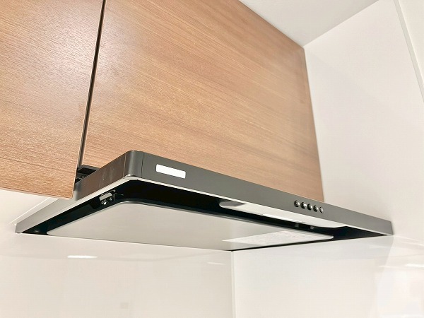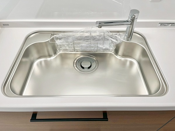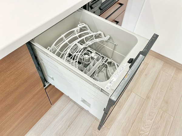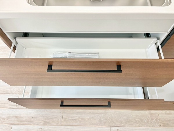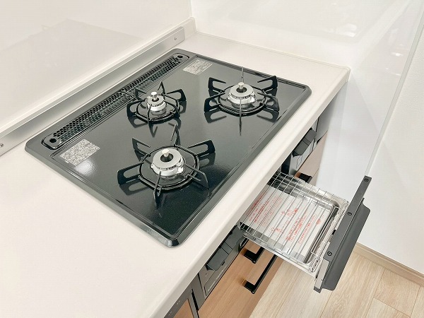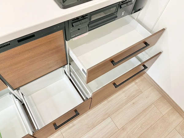 壁付けキッチンは、シンク下のスペースを無駄なく収納として活用でき、コップやお皿など使用頻度の多いものをすぐに取り出せて便利です。上部収納にはフライパンなどの調理器具も収められ、キッチンまわりを整った状態に保てます。3口コンロと食洗機を備え、機能面でも優秀なキッチンです。