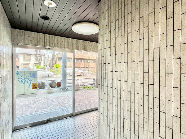 ガラスの扉を押してエントランスへと入ると、ホワイトタイルで統一された空間が迎えてくれます。左手にはポストを、奥にはエレベーターを1基ご用意しています。総戸数を考えると、混み合う心配はあまりなさそうですね。
