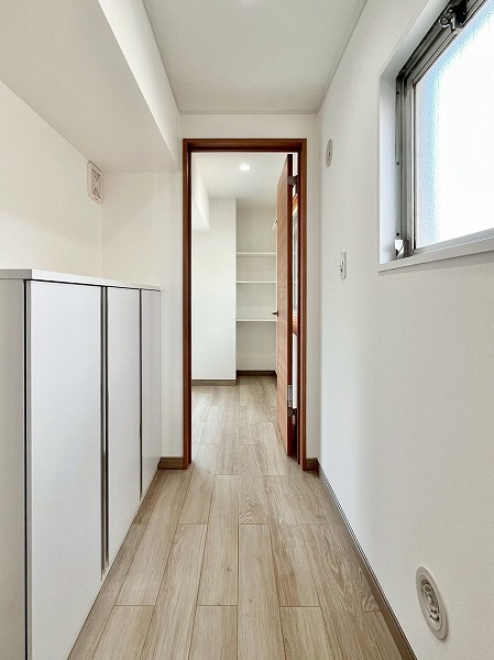 低めに設計されたシューズボックスは手が届きやすく、全ての段を無駄なく使える玄関収納。換気窓を備え、空気がこもりがちな玄関まわりも快適に保ちやすい設計です。メインルームに入る手前に扉が設けられており、外と中がはっきりと分けられたメリハリのある暮らしを送ることができます。