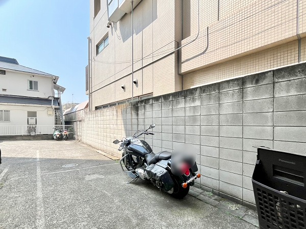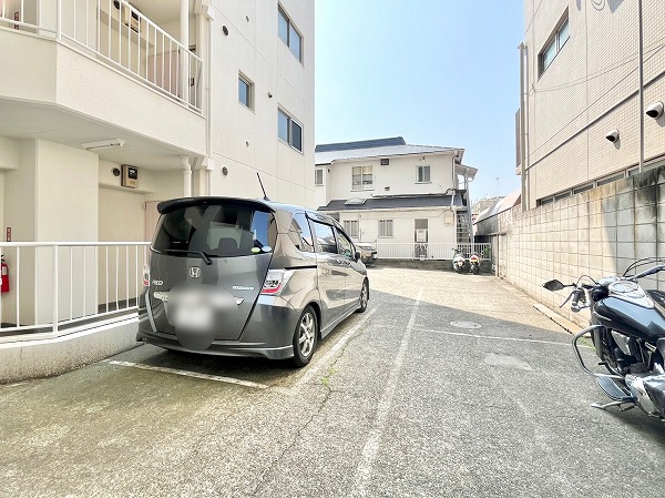 エントランスを奥へ抜けると、駐輪場がありました。雨から車体を守ってくれる大きめの屋根が付いており、安心です。隣には駐車場も設けられ、バイクも並べて停められているようでした。