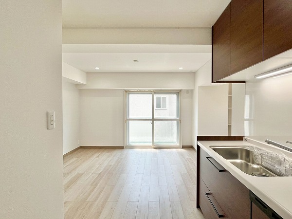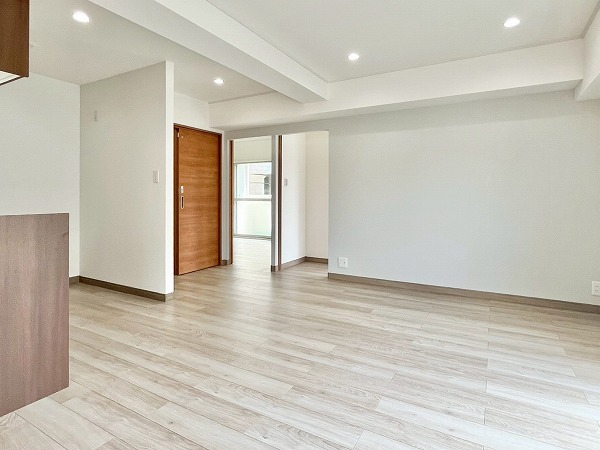 11.5帖のリビングダイニングキッチンは、ソファや大きめのテーブルを置いても圧迫感の出ない広さ。お部屋に入った時も、キッチンにいても視線が通り抜け、どこにいても開放感を感じられる設計です。隅にはさりげなく収納が設けられ、文房具や充電機器など細かいアイテムの収納にぴったり。
