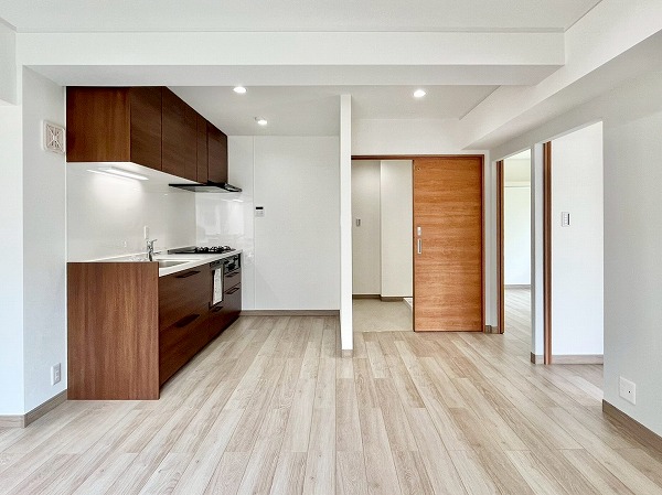 2階に位置する2LDKは、扉や水回り設備に温かみのあるブラウンの木目が用いられ、白木のフローリングとのコントラストが居心地のいい空間です。西・南・北の三方角部屋になっており、換気をすれば爽やかな風が通り抜け、1日を通して柔らかい光が差し込みます。