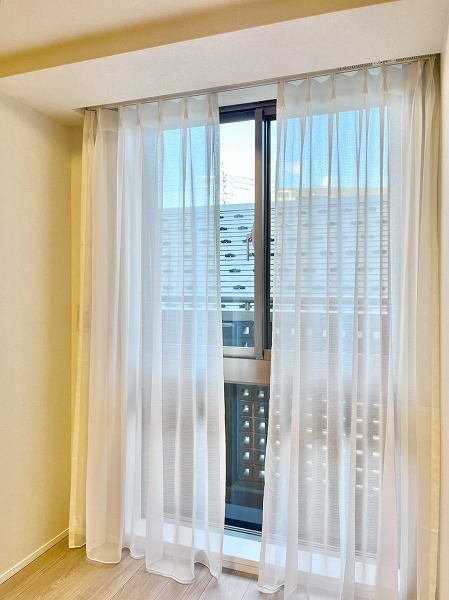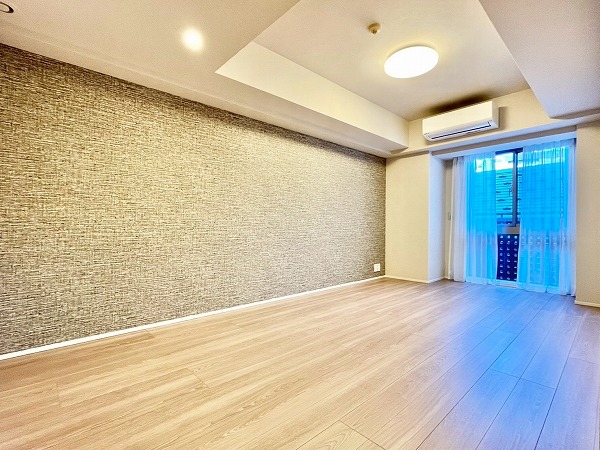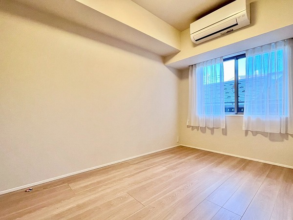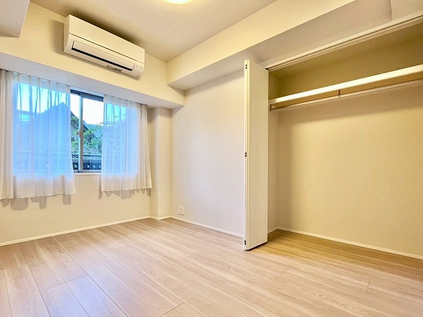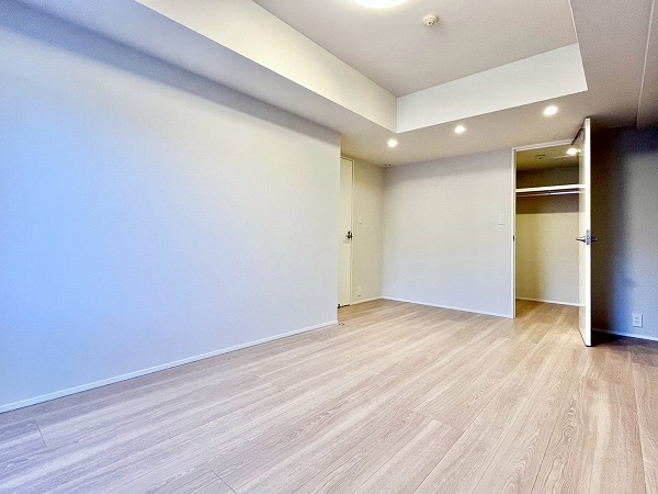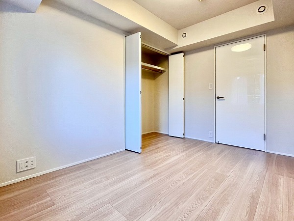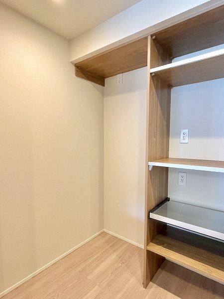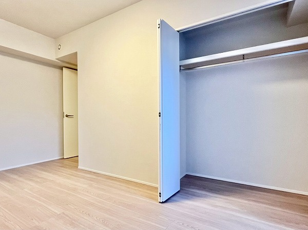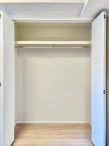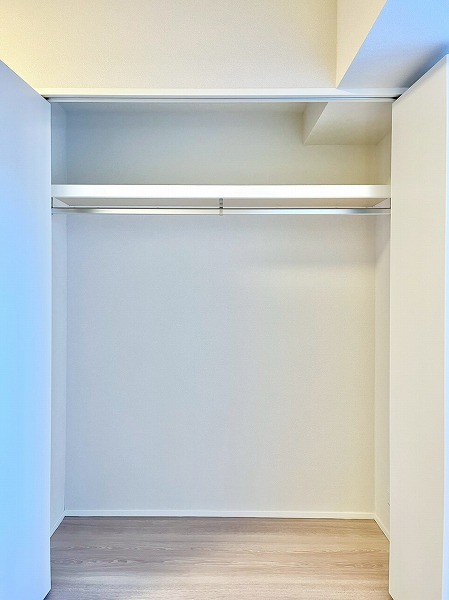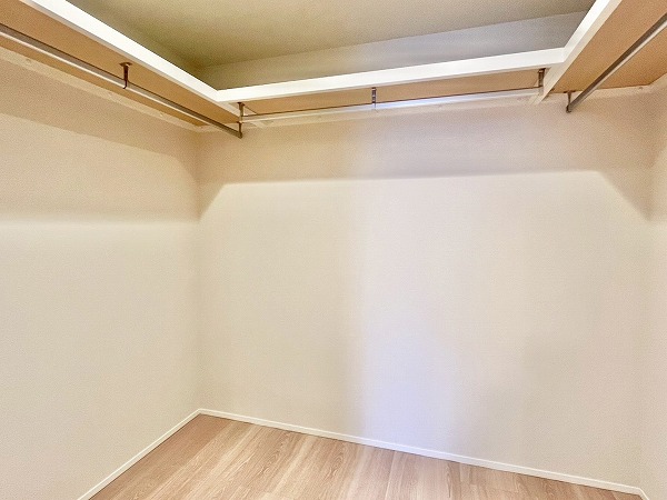 ファブリック調のクロスがアクセントのお部屋はおよそ9.5帖。室内のウォークインクローゼットは3面にハンガーポールが渡され、手持ちのお洋服をすべてしまえそうです。すべての洋室にはクローゼットが設けられており、お部屋ごとのアイテムの整理が完結する使い勝手の良さも魅力。