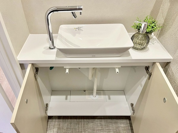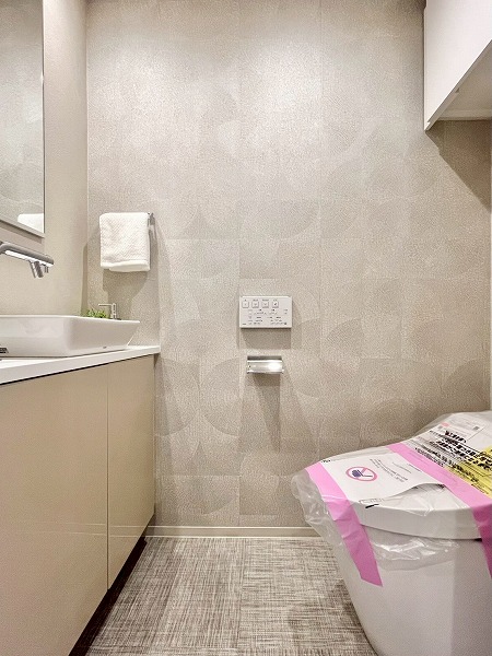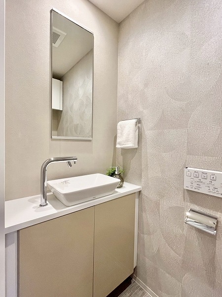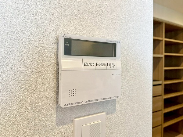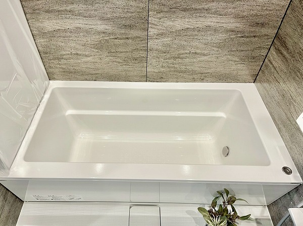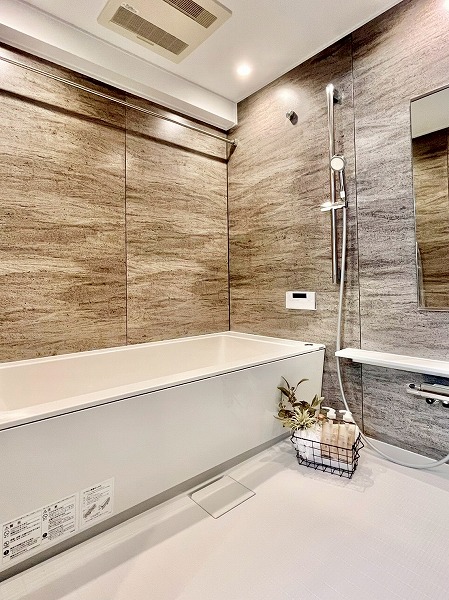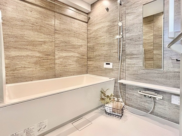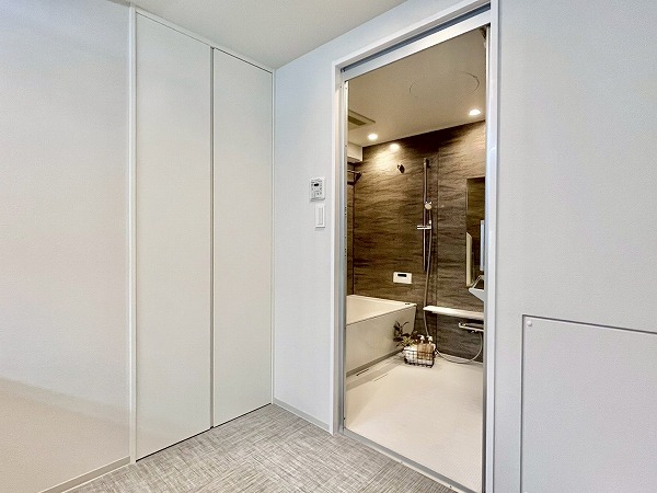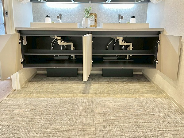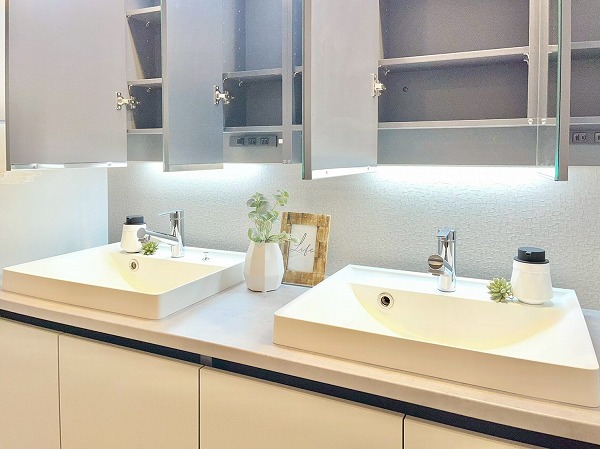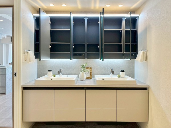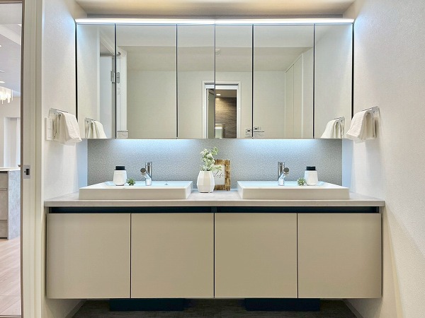 ダブルタイプの洗面ボウルが並び、清潔感溢れるパウダールーム。朝の時間に混み合うストレスを解消し、落ち着いて身支度を整えられます。鏡裏の収納は扉がひとつひとつ独立して開き、使い勝手の良さが感じられました。後ろに続くバスルームは1620サイズのワイドな造りになっており、追い焚き機能&浴室乾燥がついた充実の造り。