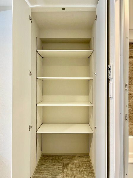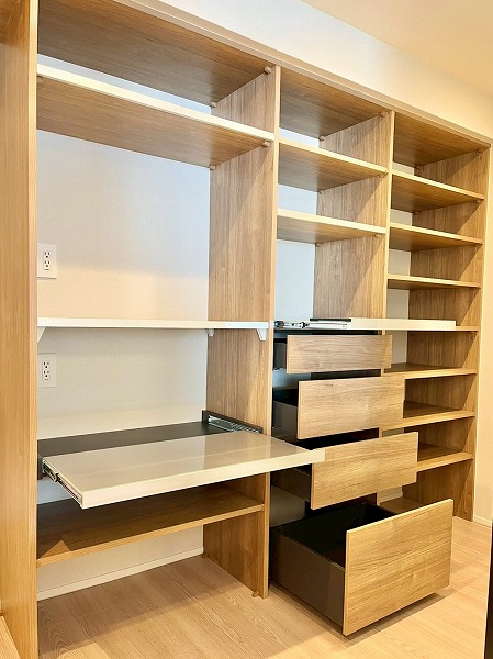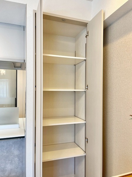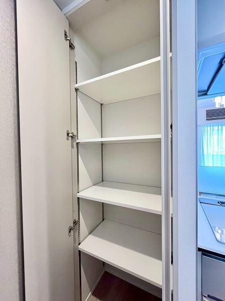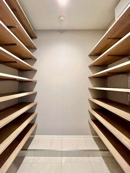 キッチンの背面には広々としたパントリーを設置し、調理家電からまとめ買いのストック、ペットボトルや段ボールまでまとめて収納しておけるのがポイント。冷蔵庫に加えて小さめの冷凍庫なども置けそうな余裕がありました◎家族全員分の食料やお菓子を並べておけば、なんとも魅力的なスペースになりそうです。