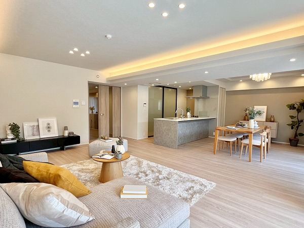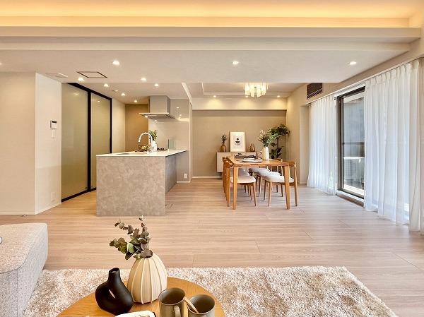 ファミリー揃ってのびのびと生活できる、開放感たっぷりな3LDKのご紹介です。およそ26.7帖のメインルームには大きなテレビやL字ソファもゆったりと配置でき、ゆとりある動線が魅力。南西向きの大きな窓からは明るい光が差し込み、家族団欒の時間を優しく包み込む理想の住空間です。