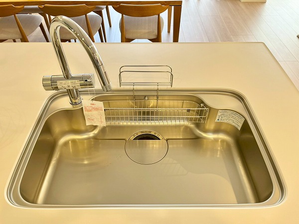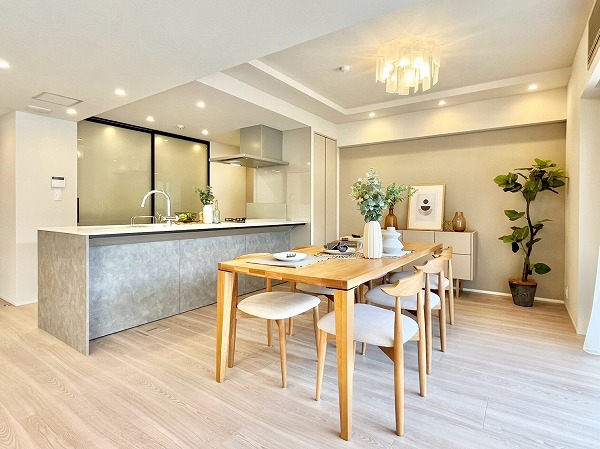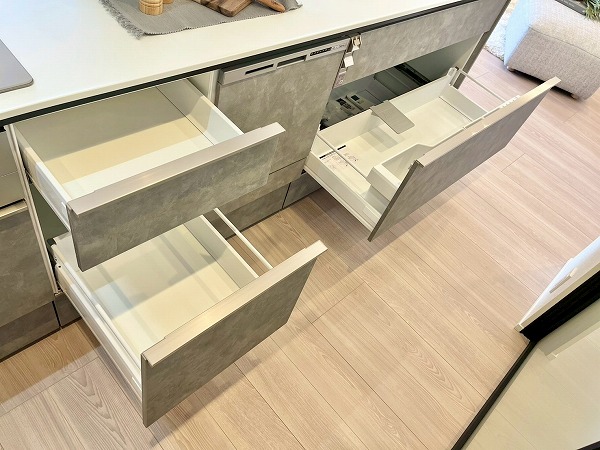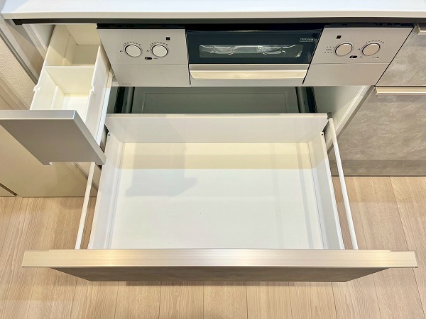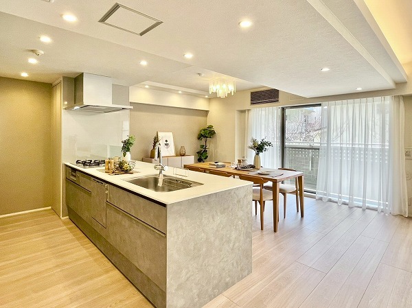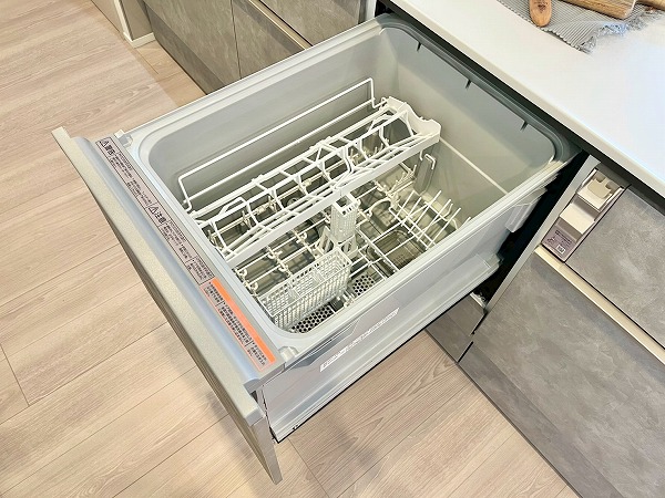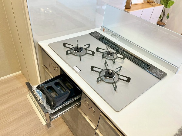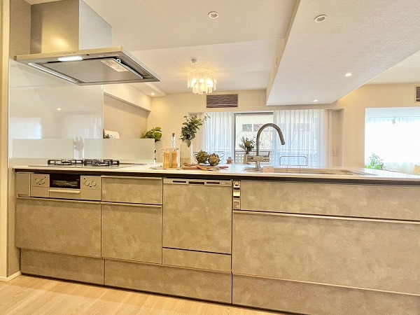 3口コンロを備えたグレーのオープンキッチンは、美しい柄目がさりげない高級感を添えるデザイン。シンク下には大容量の食洗機がすっきりと収まり、日々の家事をしっかりとサポートしてくれます。ダイニング・リビング・バルコニーまで見渡せるため、家族の様子を見ながらのお料理ができそうです。