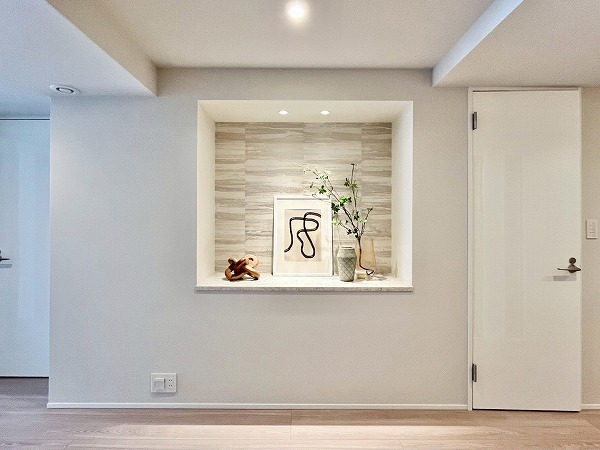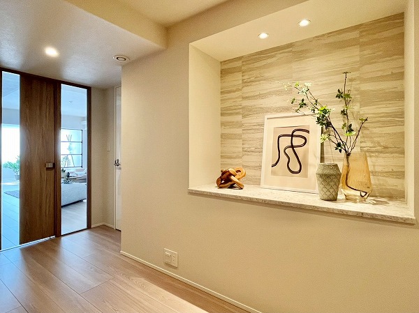 玄関を開けるとアートやお花を飾るのにちょうどいいカウンターがお出迎え。さりげない個性を添えられるスペースは、来客時にも好印象です。右手には3つの洋室、左手にはリビングダイニングキッチンが続き、家族の時間とプライベートにメリハリをつけた生活が叶う間取りです。