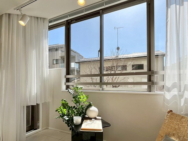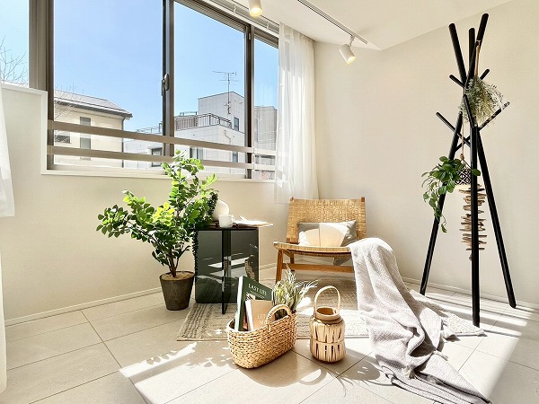 光の降り注ぐコンサバトリーは使い方無限大。ハンモックチェアやふかふかのクッションを置いてくつろぎの読書スペースにしたり、日当たりの良さを生かして観葉植物を楽しむことも。扉からそのままバルコニーに出ることができるので、ペットとの遊び場にもぴったりですね。