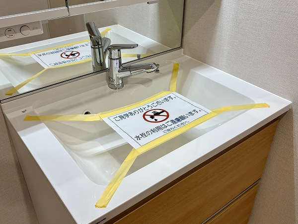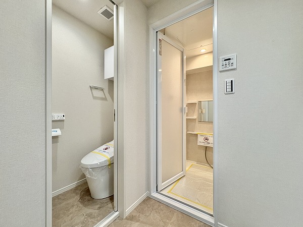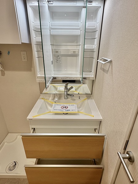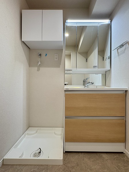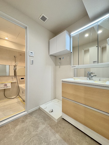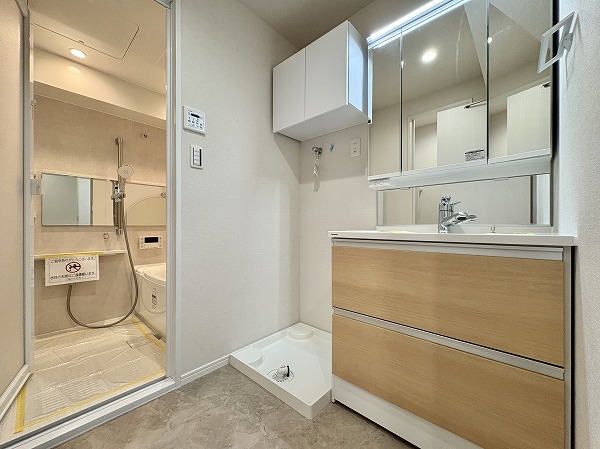パウダールームには3面鏡タイプのミラーキャビネット付き洗面台を設置し、身支度もスムーズ。収納力も高く、化粧品や日用品をすっきり整理できます。洗面所・浴室・トイレ・洗濯機置き場がまとまっており、家事動線も快適です◎
