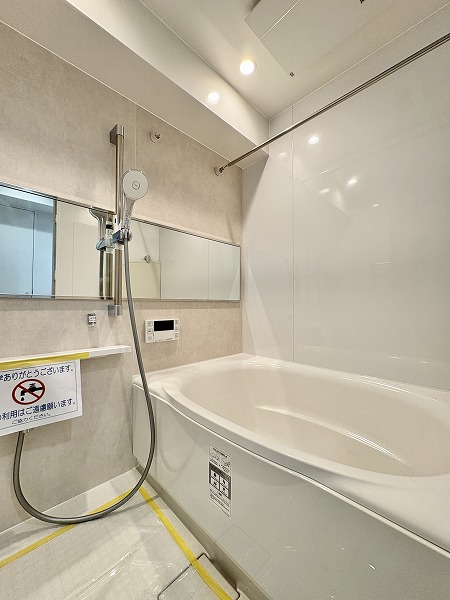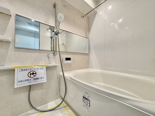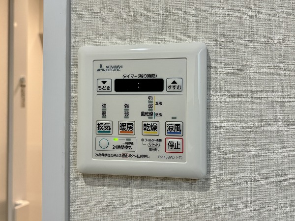 明るく清潔感のあるカラーでまとめられたバスルーム。浴室乾燥機と追い焚き機能が備わっており、機能性も抜群。ワンタッチでお湯を温め直すことができるので、いつでも快適なバスタイムを楽しめますよ♪