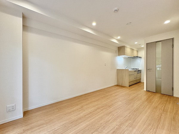 ホワイトクロスと木目調フローリングが調和した約9.5帖のメインルーム。やさしい色合いが、自然と心を落ち着かせてくれる空間です。大きなテラス窓を開ければ、心地よい光と風を感じながらバルコニーへ出られます☀
