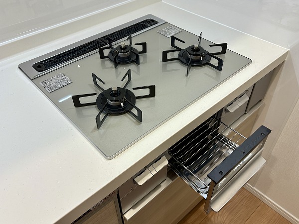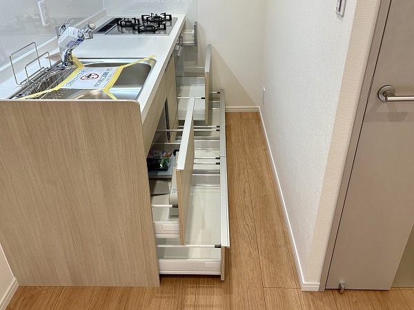 キッチンは無駄のない壁付けタイプ。手の届く範囲に収納がまとまり、効率良く作業できるレイアウトです。リビングへの動線も近く、料理の配膳もラクラク。忙しい日々の家事をサポートします。