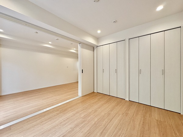 清潔感ある約6.1帖の洋室は、落ち着いたトーンでどんなインテリアにもマッチ。引き戸でリビングと仕切ることができ、ライフスタイルに合わせた使い方が可能。さらにクローゼットを2つ備えているので収納力も抜群です◎