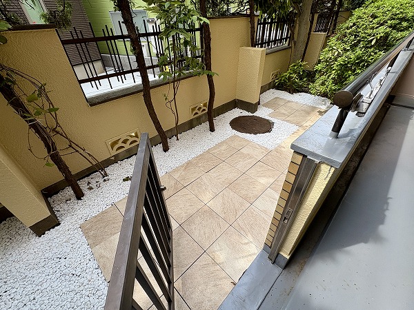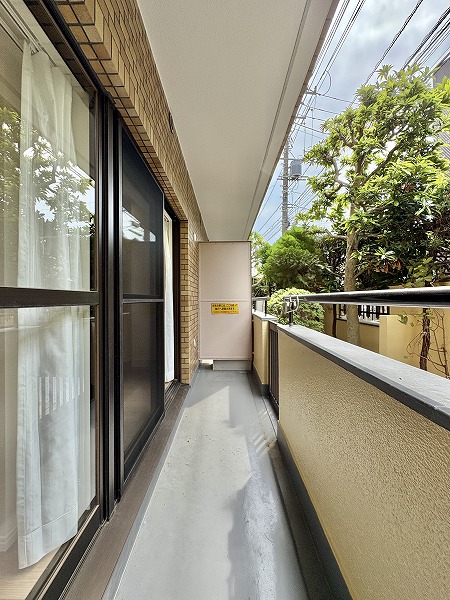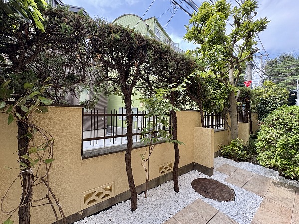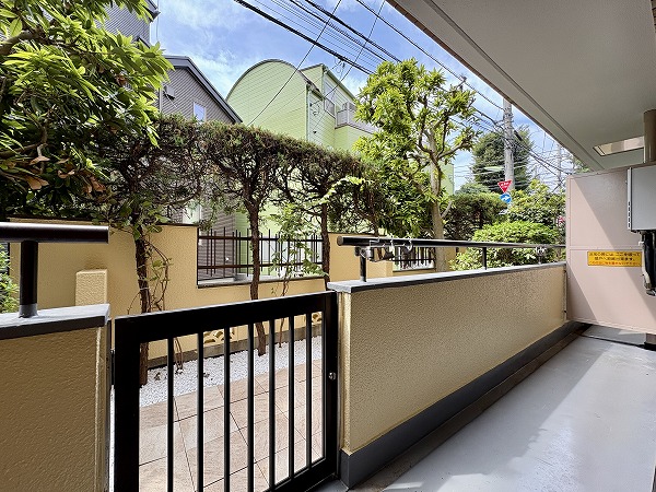 エントランス周りには丁寧に手入れされた植栽があり、管理の良さがうかがえます。屋根付きのアプローチなので、雨の日でも傘の開け閉めをゆっくり行えるのが嬉しいポイント。