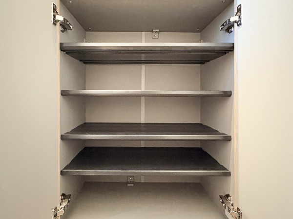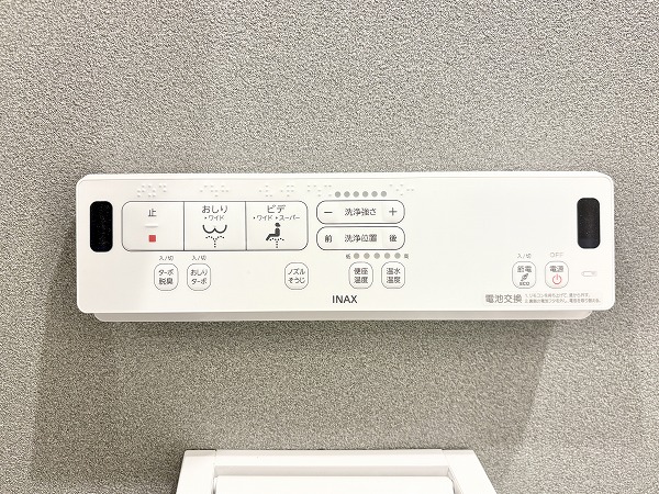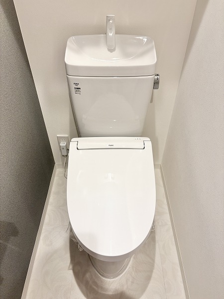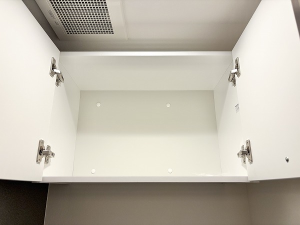 独立タイプのトイレは、バイカラーのクロスから洗練された印象を受けました。シンプルでありながらも飽きのこないデザインですよね。上部にはトイレットペーパーや清掃用品を収納できる棚が設けられています。