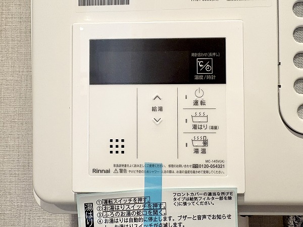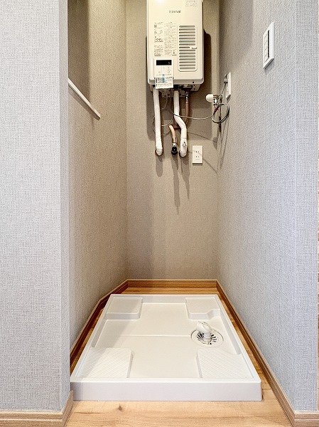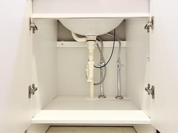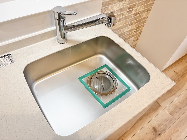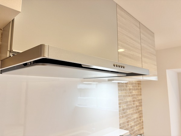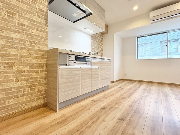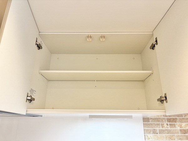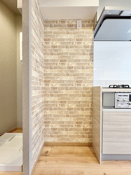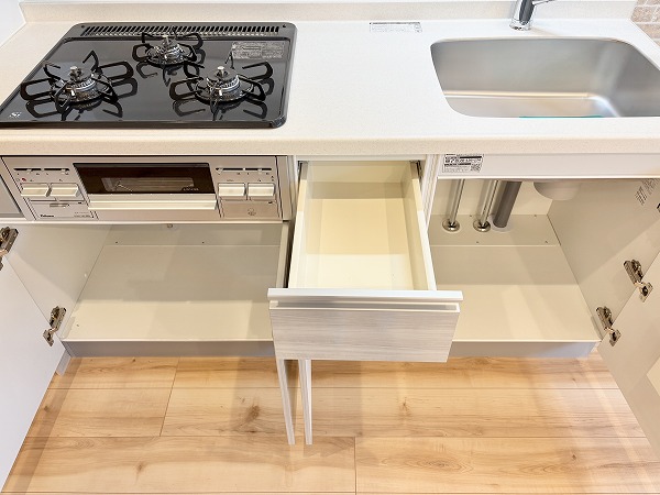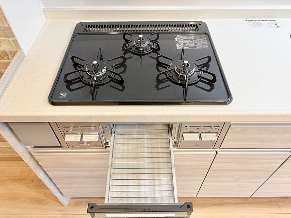 キッチンは作業に集中しやすい壁付け型。複数品同時調理が可能な3口コンロとグリルが完備されているので、お料理好きな方にも満足していただけるのではないでしょうか。上下に棚が設けられているため、キッチン用品や洗剤などをすっきりと収納しておくことができますよ。