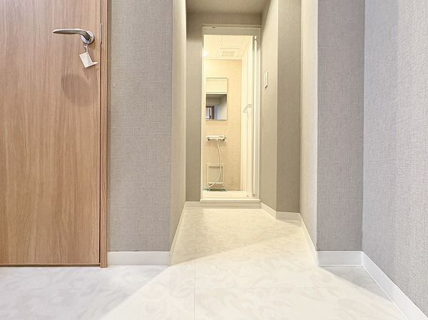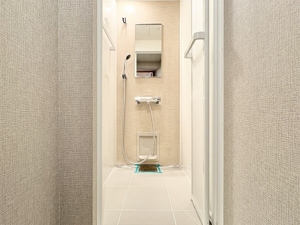 シャワールームはホワイトとベージュの淡い色味でまとめられている穏やかな空間。バスタブがなくコンパクトなため、掃除や手入れを簡単に行えるところが魅力的です。シャワーのみのため、水道代の節約にも繋がります。