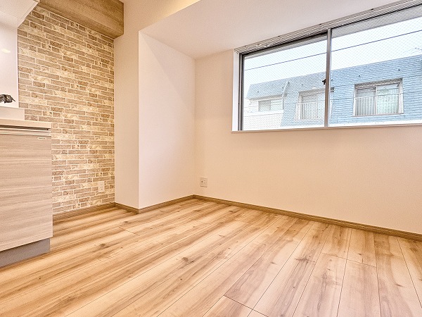専有面積32.79㎡、1人暮らしにおすすめの1DKのお部屋をご紹介します✦3階部分に位置する角部屋のため、隣人の生活音が気になりにくくプライバシーを確保しやすいのが特徴です。キッチン周りのレンガ調のクロスが可愛らしくて目を惹きます。