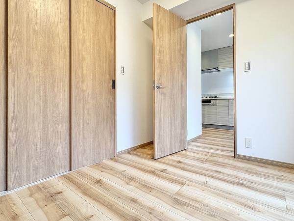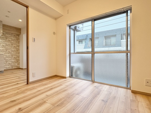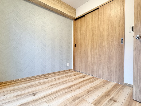 大きなテラス窓があり開放感抜群な約4.0帖の洋室。窓からバルコニーへ出入り可能なため、お部屋での作業中に気分転換としてすぐに外の空気を吸いに行くことができます。木目調のフローリングとアクセントクロスがオシャレですよね♪