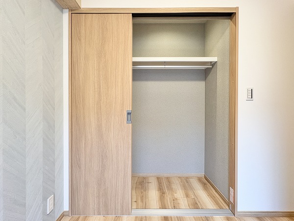 約4.0帖の洋室には大容量のクローゼットがありました。かさばりやすいダウンジャケットや丈の長いワンピースも綺麗に保管することが可能です。左の棚は、帽子やバッグなどの小物類を収納するのに適しているかと思います!